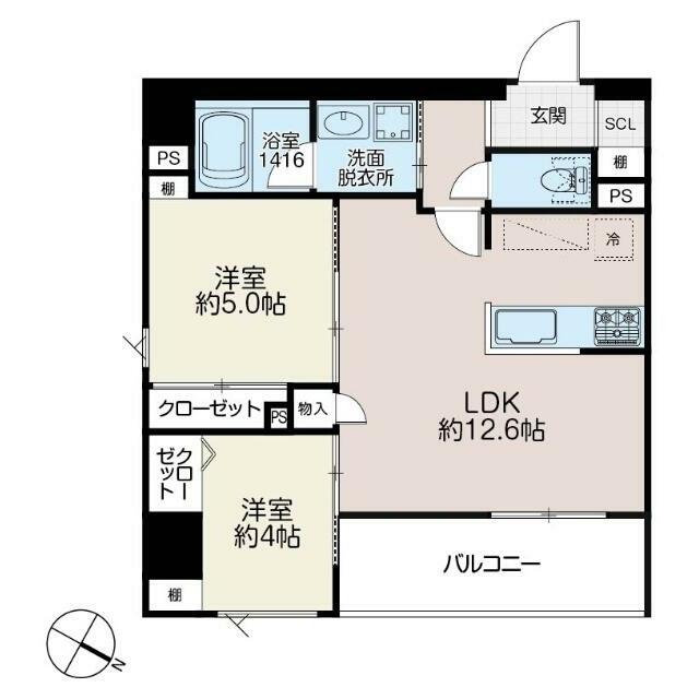 | 間取り | 2LDK(LDK12.6 洋室5.2 洋室4.5) | 主要採光面 | 北東 |
